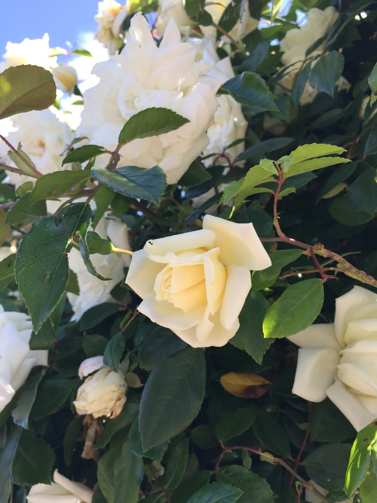 The view forward is also pretty lovely with the rose arch currently out in full bloom